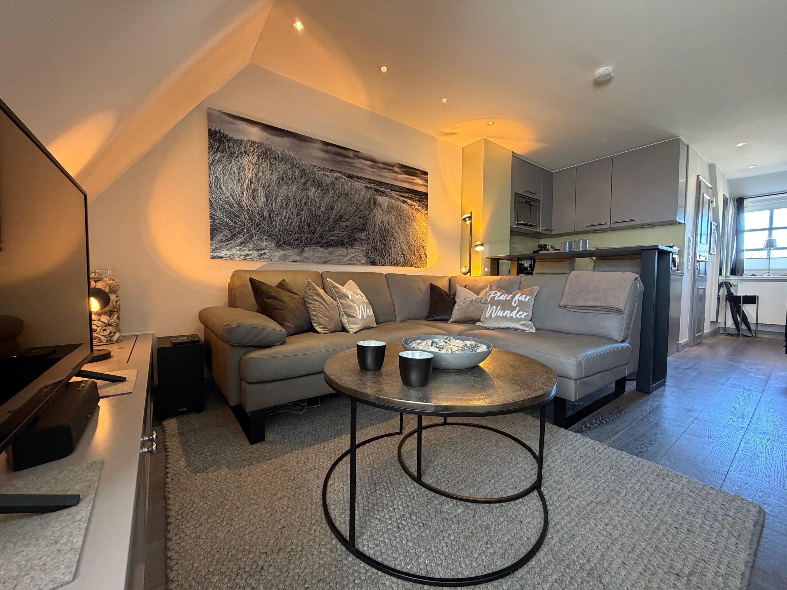 Das Appartement Syltsterne gehört zu unseren stilvollen Sylt Appartements in Rantum und ist ein wunderbarer Rückzugsort für zwei Personen. Auf 40 m² und über zwei Ebenen genießen Sie eine besondere Wohnatmosphäre mit Schlafgalerie, offenem Wohnbereich, Küchenzeile und herrlichem Wattblick. Besonders angenehm: Auch die Nutzung des Wellnessbereichs im Hotel ist bereits inklusive.